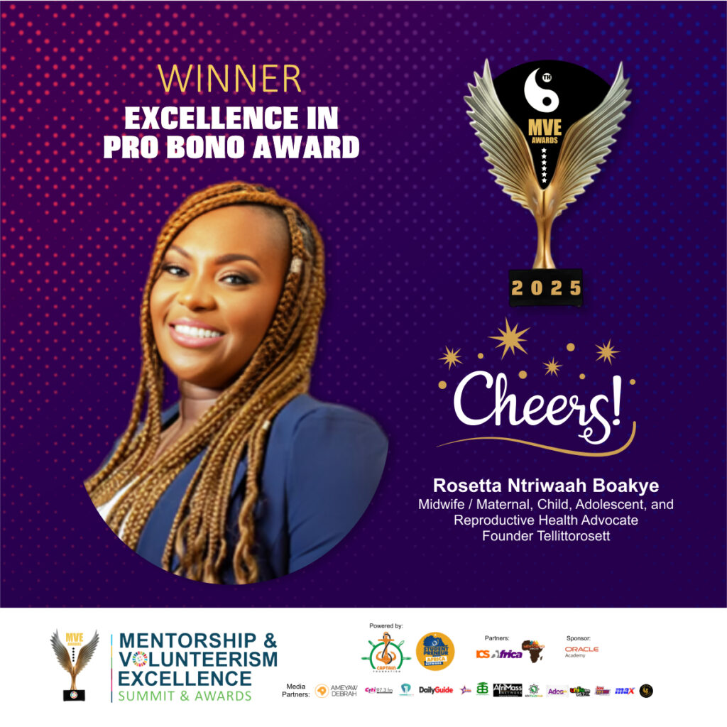 Rosetta Ntriwaah Boakye is a nationally recognized registered midwife, maternal health advocate, and social impact leader. Through TellittoRosett, she reaches thousands of girls and women—especially in underserved communities—educating them on: